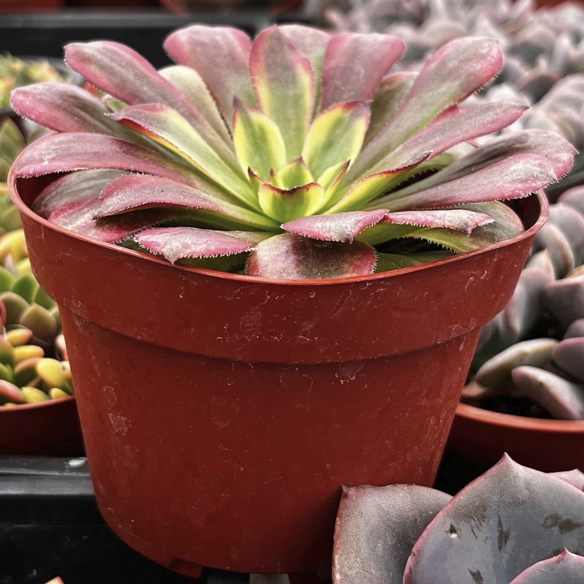 A true showstopper for arrangements, centerpieces, and gifts, Aeonium ‘Mardi Gras’ adds instant color contrast and elegance. Its compact size makes it perfect for 2"–4" pots or decorative planters, while its vibrant tones make it stand out among any succulent collection.