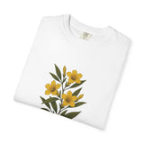 Our Carolina Jessamine T-shirt whispers of bittersweet longing and sunlit memory, like a farewell spoken through yellow blossoms and fragrant Southern air. The golden trumpet-shaped blooms evoke a joy laced with danger—beauty too bright to hold, too fragrant to forget. It is a shirt that speaks to the soul that has known both ecstasy and caution, love and its haunting echo.