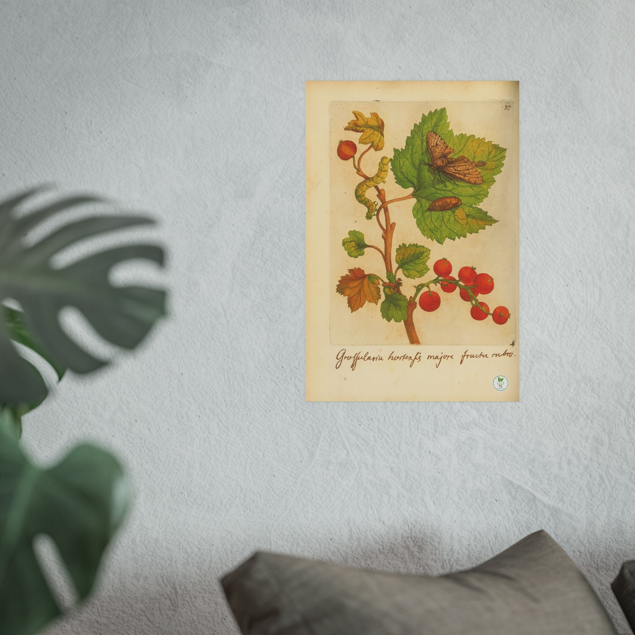 This exquisite botanical illustration captures the red gooseberry (Grossularia hortensis majore fructu rubro) in full detail, its ruby fruits gleaming beneath rich green leaves. A green caterpillar winds along the stem, while a dusky moth perches above—a poetic study of life’s delicate cycles. The piece evokes the charm of early natural history prints, blending horticultural accuracy with the grace of hand-colored engraving. Perfect for collectors of antique botanical art, naturalists, and those who appreciate the timeless harmony between plant and insect.