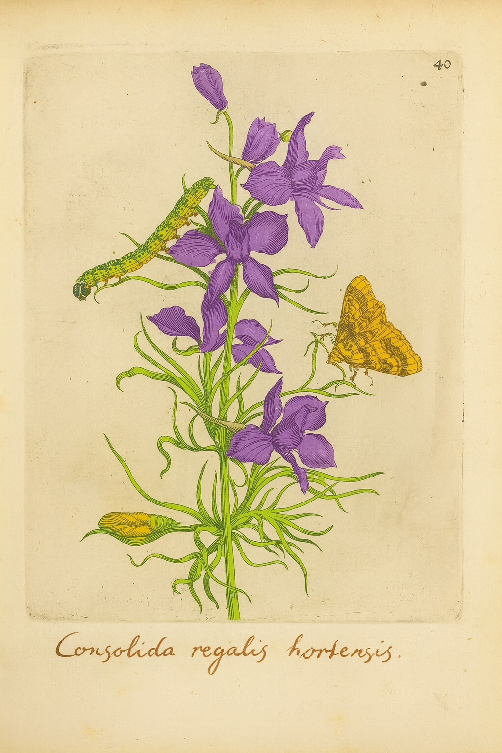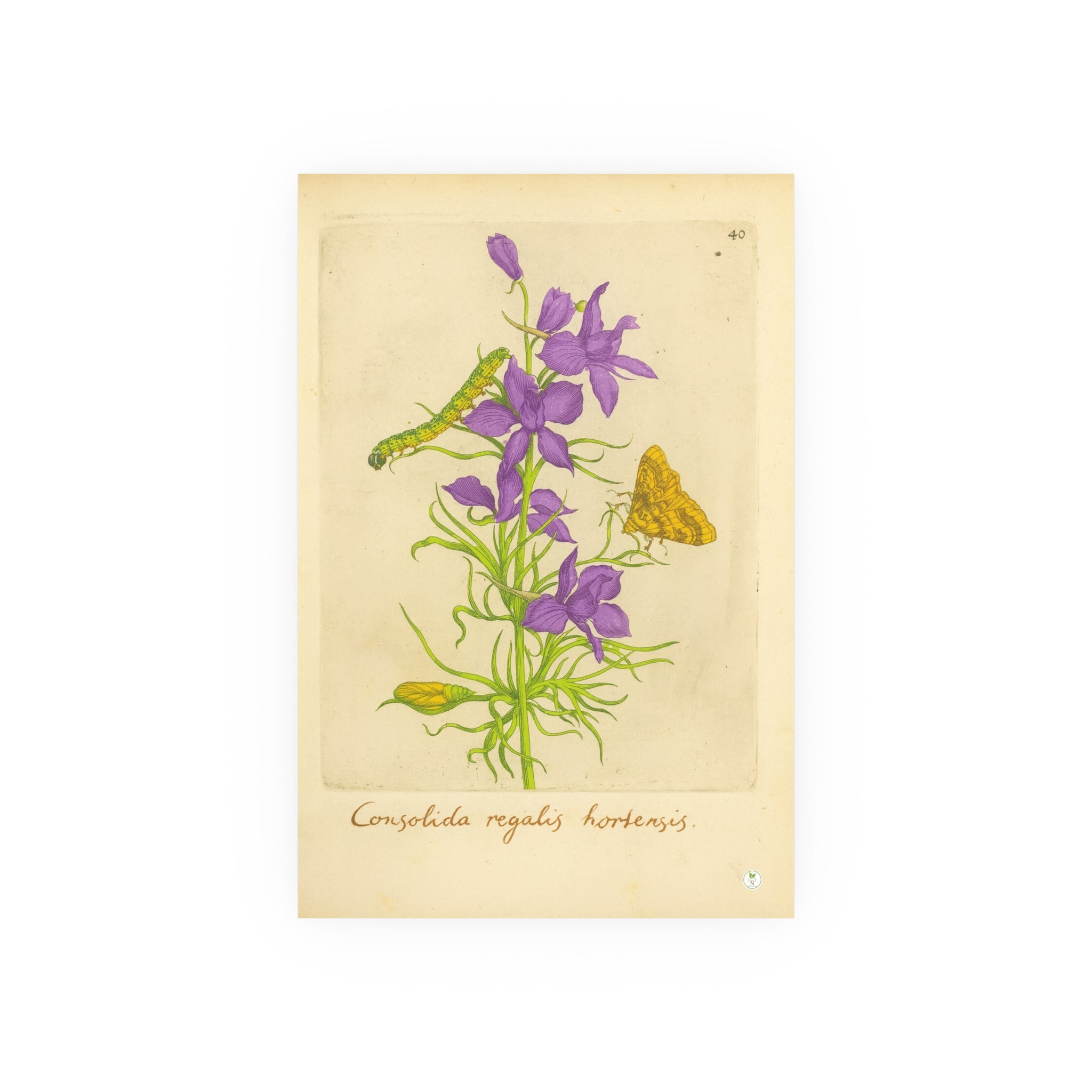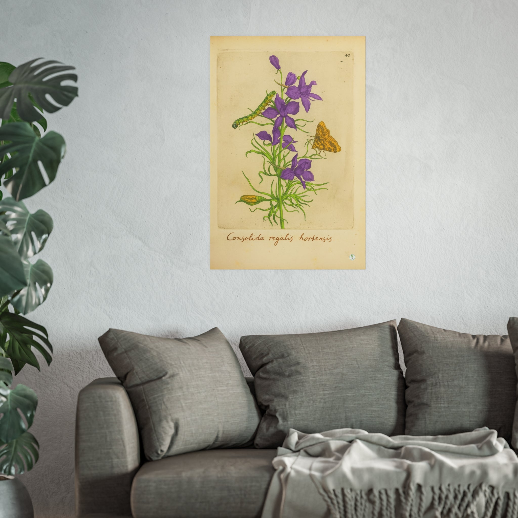 Royal Larkspur with Moth and Caterpillar, Consolida regalis hortensis Botanical Art Poster