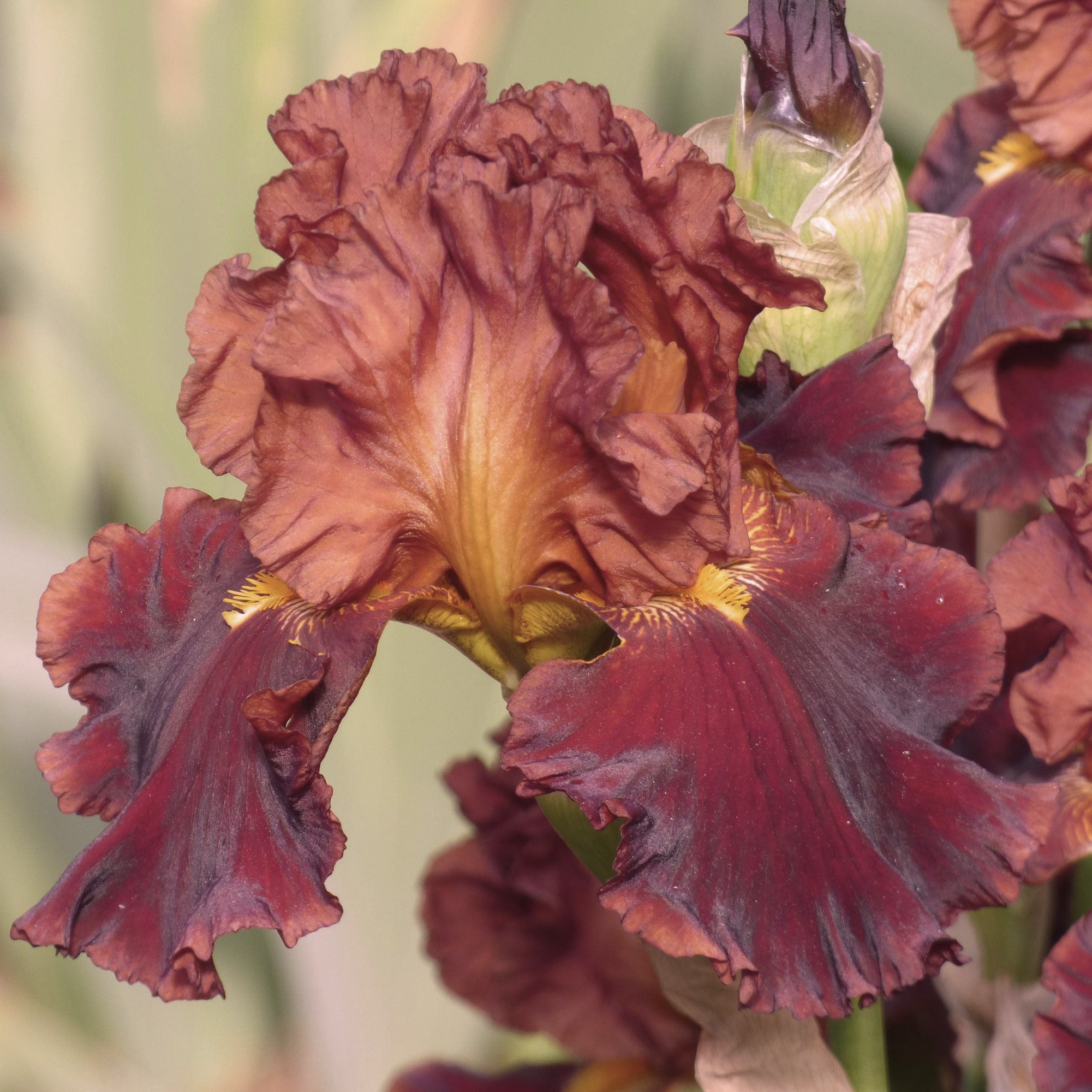 A perfectly shaped iris incorporating shades of red, red bronze and deeper brick red all on large ruffled bloom. Proud bronze red standards are outwardly ruffled atop falls with brick red centers and bronze red edging. Just stunning with bright gold beards. As if the coloration was not enough, Valentino is wonderfully fragrant with a unique, pleasing aroma.  Early mid-season bloomer. Grows to 36" tall in height and is hardy for zones 3-10. A vigorous perennial plant it will return each spring, and multiply each year, providing you with a reliable abundance of blooms. Strong stems make this a great cut flower!