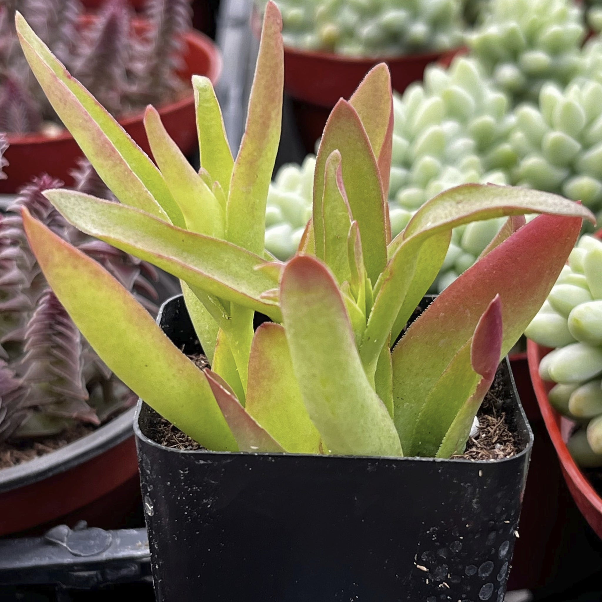 A striking succulent known for its fiery coloration, Campfire brings vivid contrast to any arrangement. Its elongated, pointed leaves grow in stacked rosettes and transition from lime green to bright red when exposed to sun and cooler temperatures. Compact and fast-growing, it forms low clusters that spread over time, making it perfect for vibrant ground cover or bold accents in containers.