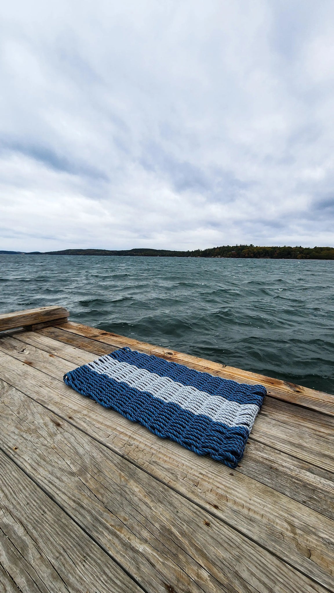 A beautiful Navy Blue and Light Gray, hand made rope mat made on the coast of Maine using the very same rope that lobstermen use to tend their traps.
