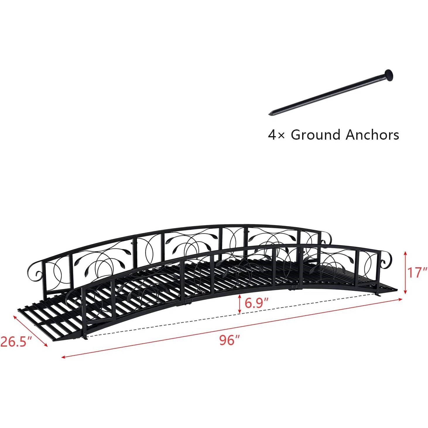 - Sturdy Construction: With solid metal and sturdy screws, our garden bridge can allow 2 to 3 people to stand on it. And there are 4 ground anchors that will be used to fix the bridge on the ground stably, which will make it safe when you pass by.