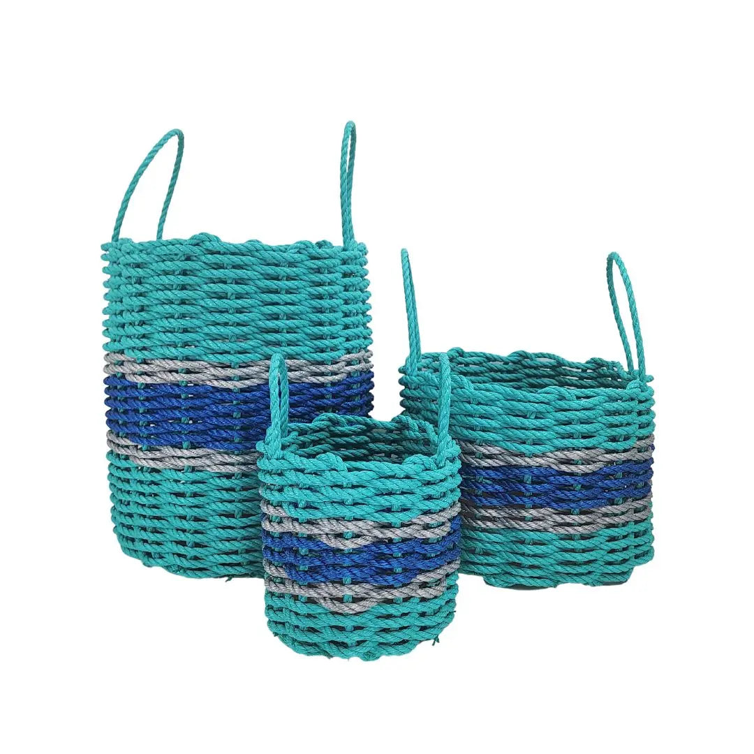 Handcrafted on the coast of Maine, these Authentic Lobster Rope Storage Baskets in Teal and Blue with Light Gray Accents blend rugged utility with vibrant coastal style. Woven from the very same lobster rope trusted by lobstermen to haul their traps, this basket is built to endure while adding a fresh, nautical touch to any space.