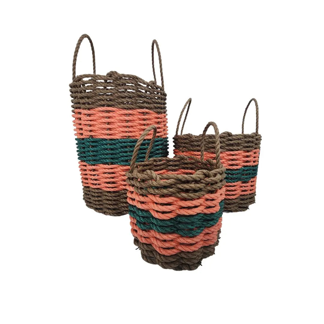 This is a colorful handmade basket, woven with the very same rope that fishermen use to tend their gear on the coast of Maine. Lobster rope is extremely durable, lasting against strong tides and storms at sea, while the colors are vibrant and long lasting as well.