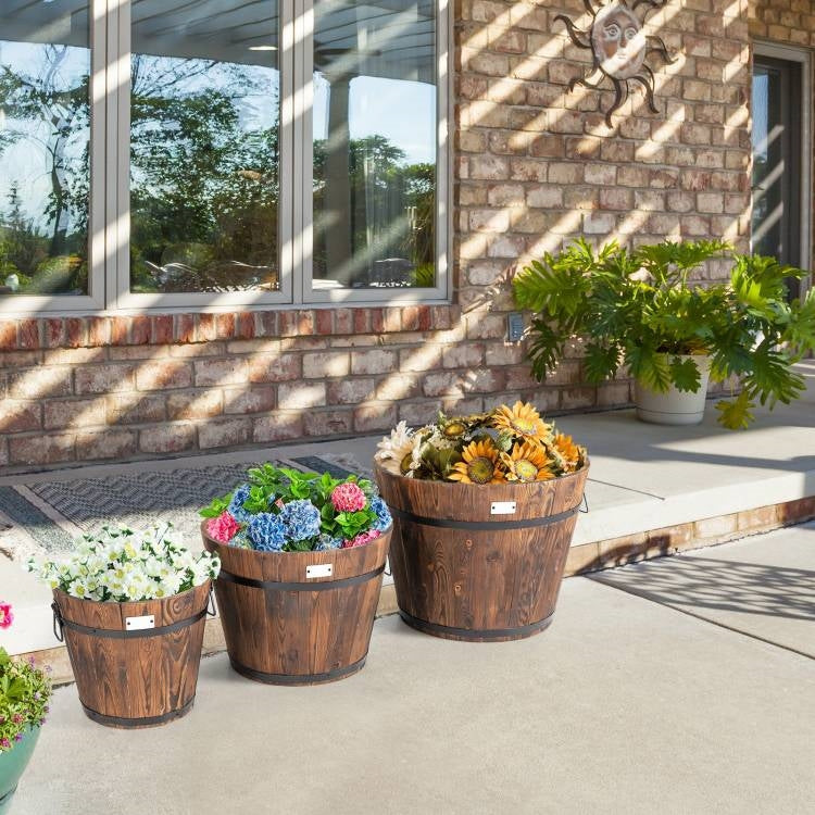 Set of 3 Outdoor Wooden Barrel Planter Pots with Handles 11.5, 15, and 18 inch - FREE SHIPPING