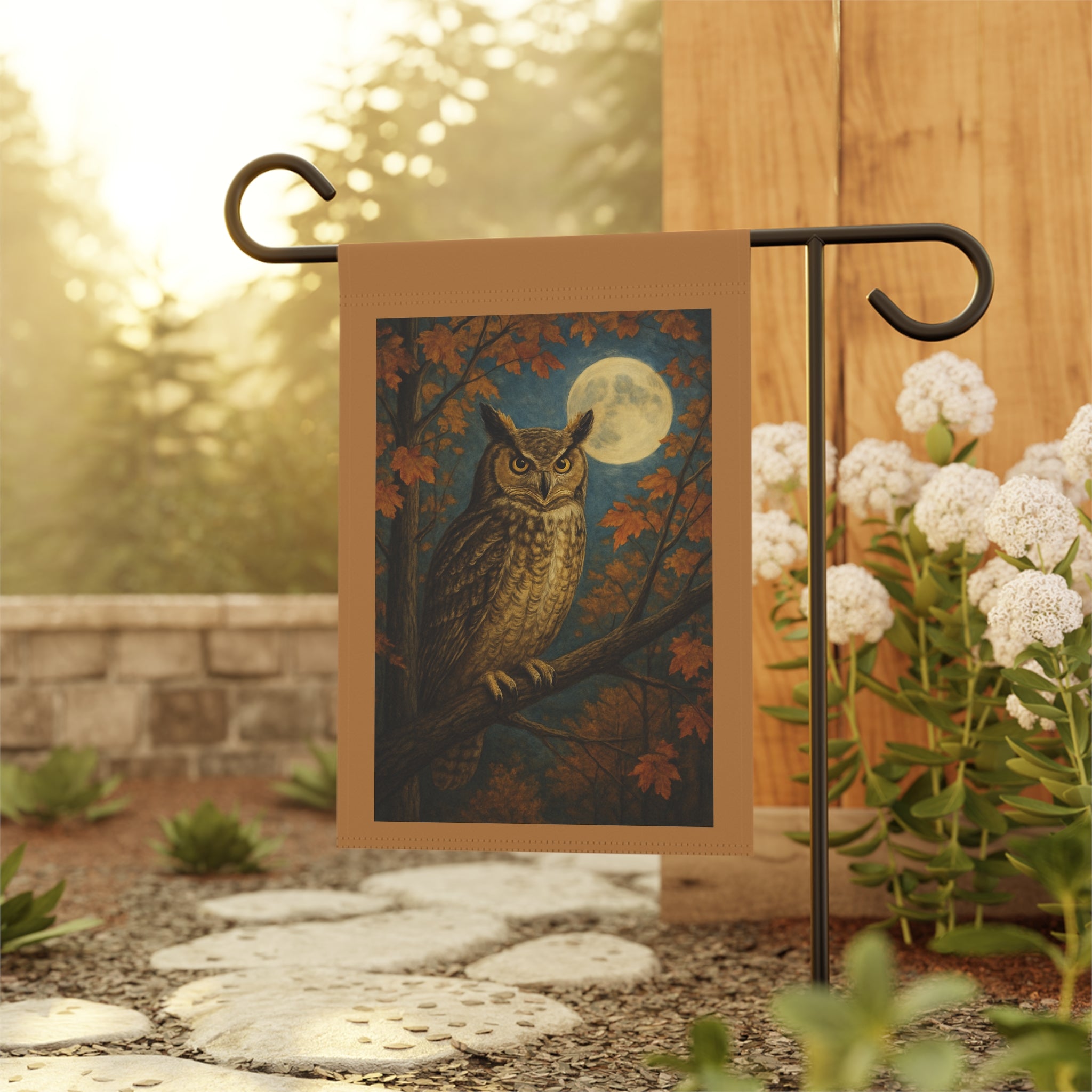 This garden banner features a beautifully lit nighttime scene of a great horned owl perched on a tree limb, framed by glowing autumn leaves and a luminous full moon in the background. Designed for clarity even on dark backgrounds, this realistic artwork blends warm harvest tones with cool night blues for a striking seasonal display. Perfect for fall garden decor, wildlife lovers, or moonlit Halloween themes.