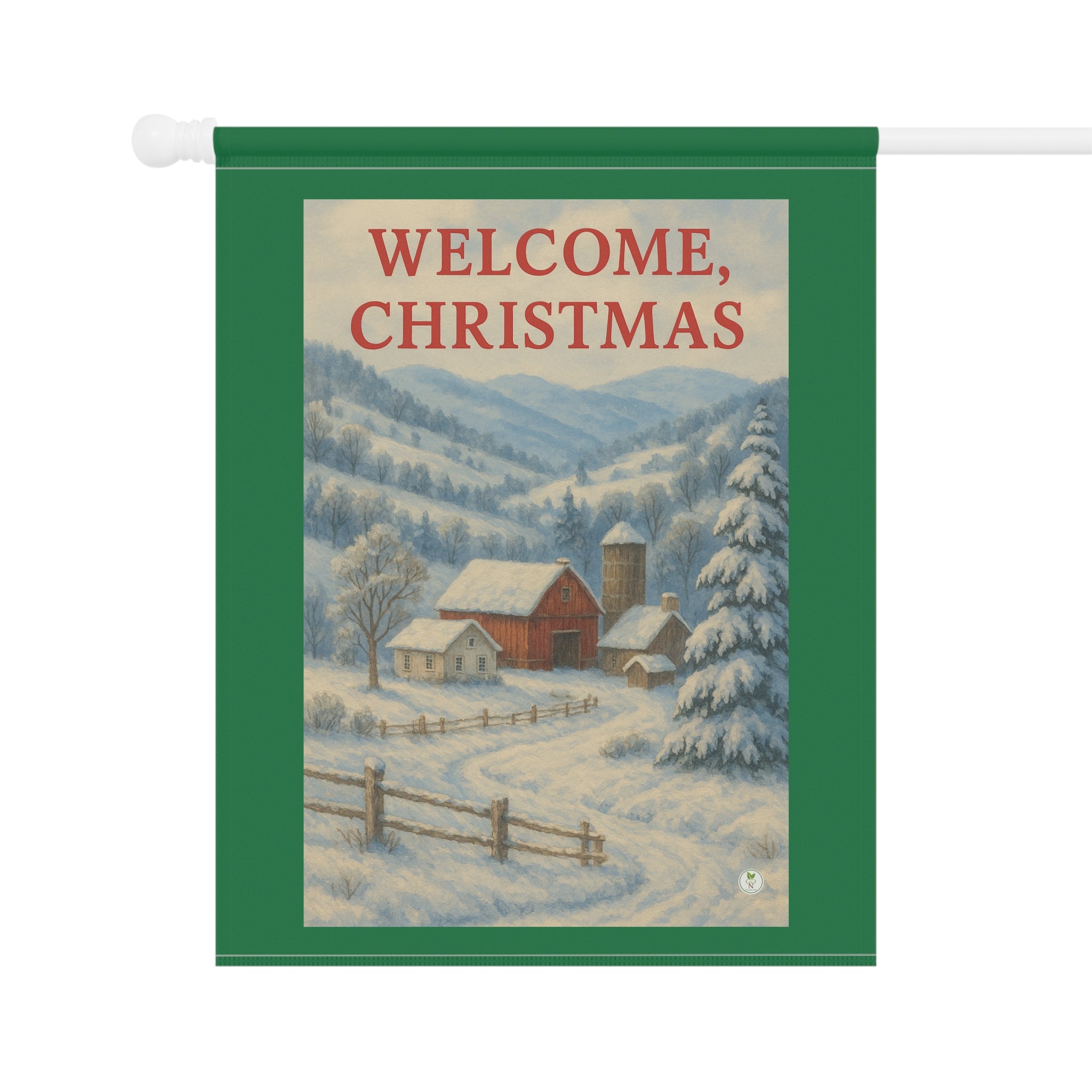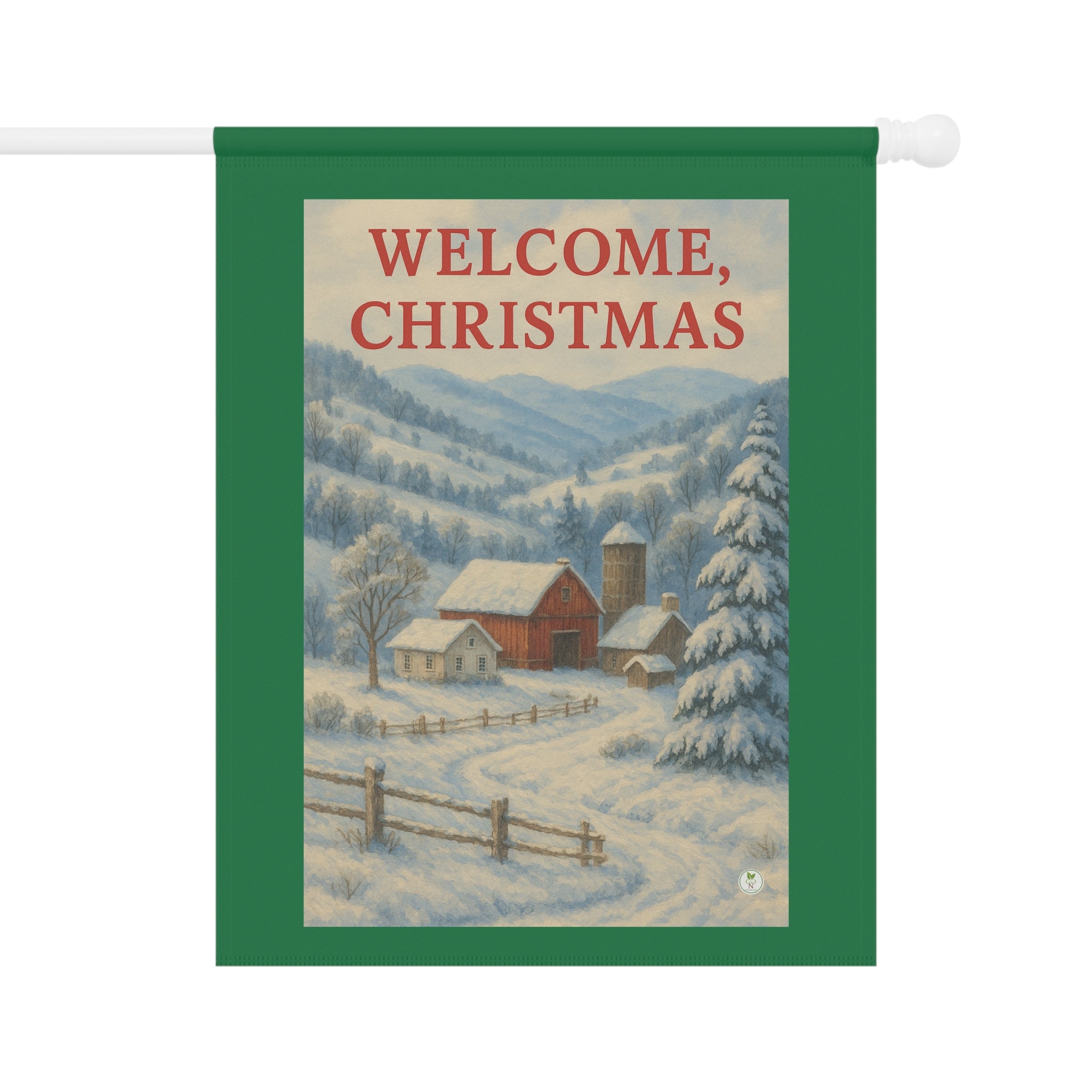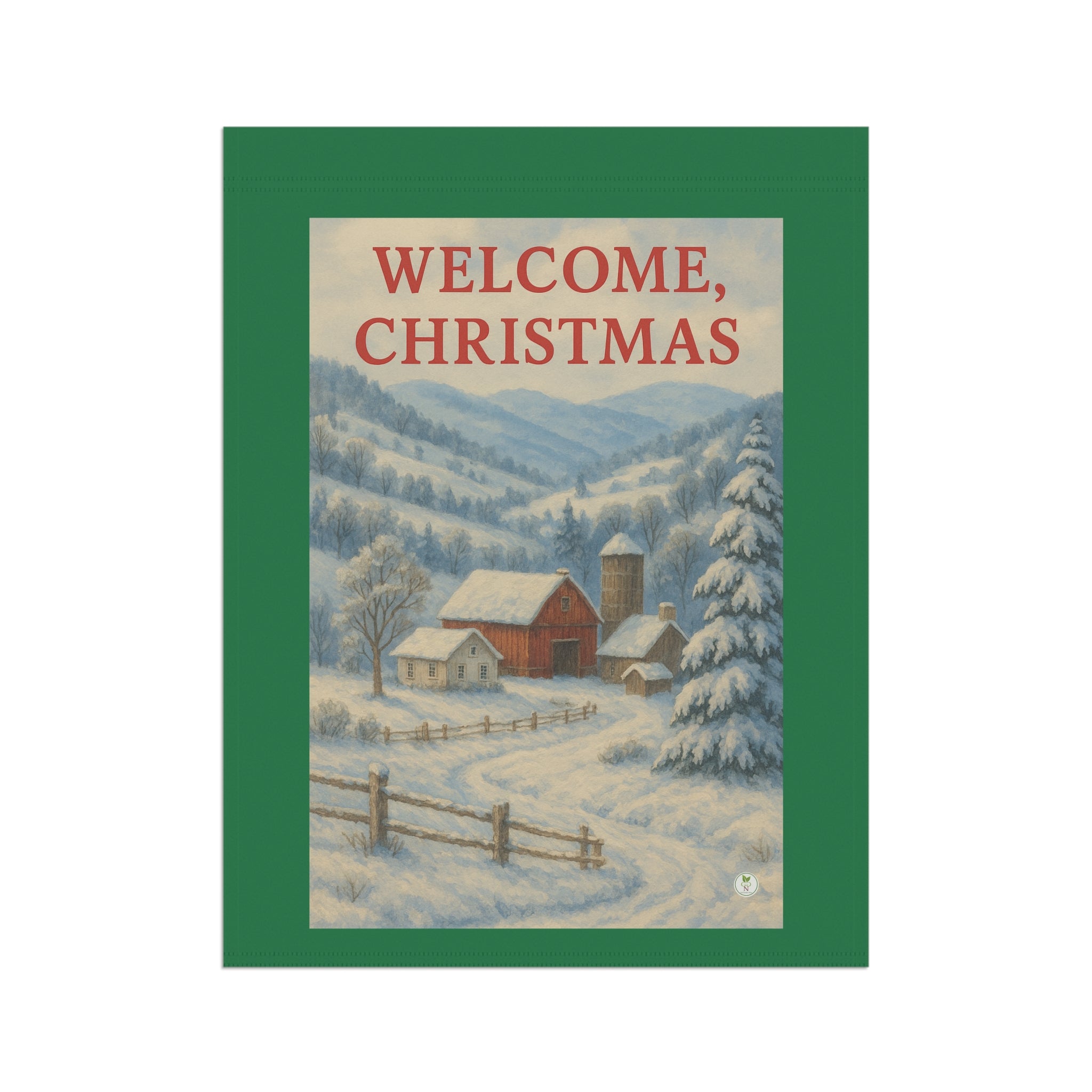 Bring the warmth of a country Christmas to your home or garden with this GoGardenNow exclusive design. A peaceful red barn and farmhouse rest in a snow covered mountain valley beneath soft blue winter skies. The bold red lettering of “Welcome Christmas” crowns the scene with classic holiday cheer. Perfect for adding a touch of rustic charm and timeless beauty to your outdoor decor, this banner captures the quiet joy and reverence of the season.