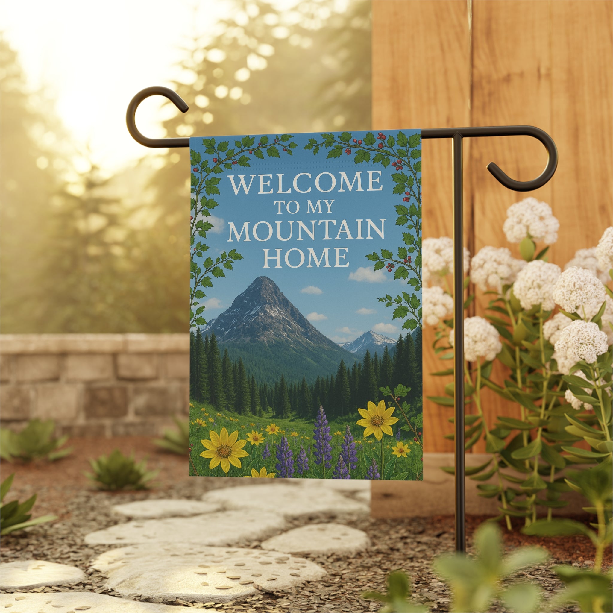 Bring the beauty of the mountains to your garden with this realistic spring mountain scene. Snow capped peaks rise above a lush meadow filled with golden balsamroot and purple lupine, framed by deep green pine forests and a clear blue sky. The bold white serif text outlined in black reads Welcome To My Mountain Home, inviting guests with a sense of peace and grandeur. Perfect for cabins, lodges, or anyone who treasures the mountain life.