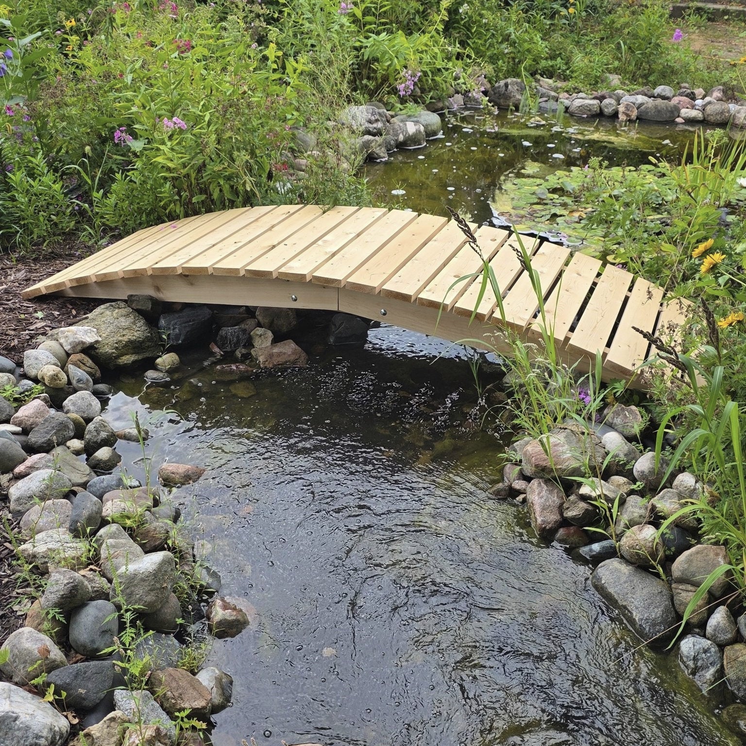 Our 8-foot rustic wooden garden bridge combines natural cedar craftsmanship with practical design, this handcrafted bridge creates an authentic focal point for gardens, water features, and landscaped paths.