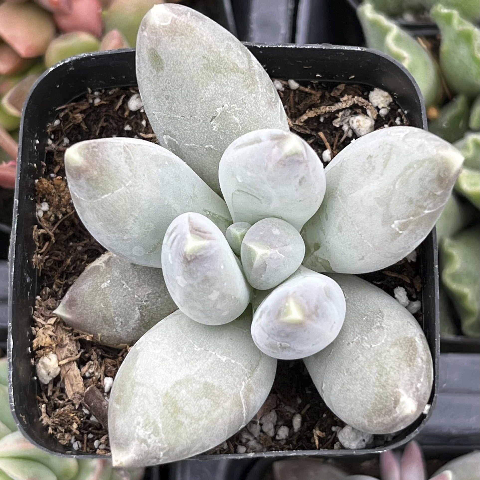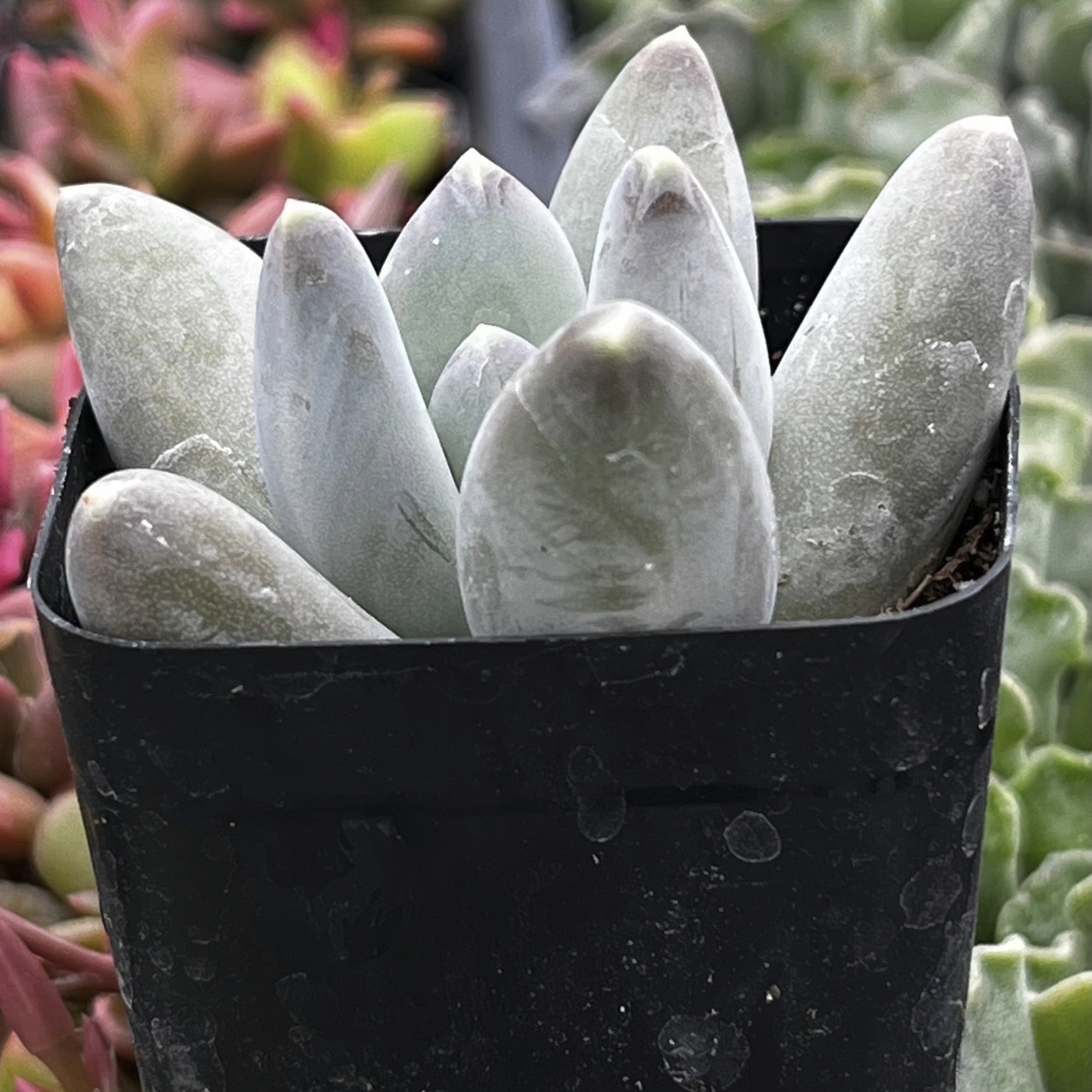 The Pachyphytum 'Buster' is an adorable succulent loved for its thick, plump leaves that form a rounded, symmetrical rosette. Its smooth, chalky leaves are coated in powdery farina, giving them a silvery-lavender hue that can blush pink under bright sunlight. With its chunky appearance and soft pastel tones, 'Buster' is perfect for adding playful texture to any arrangement or container garden.