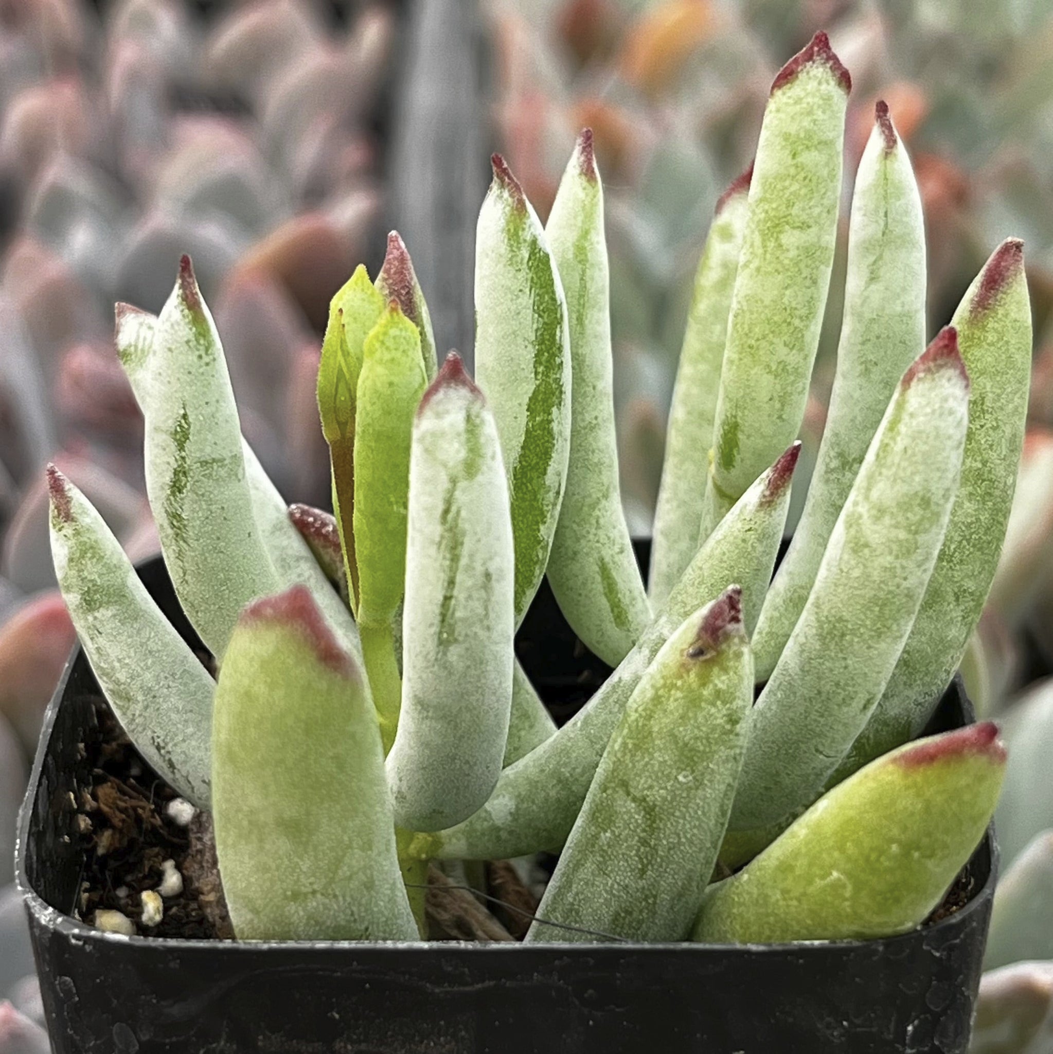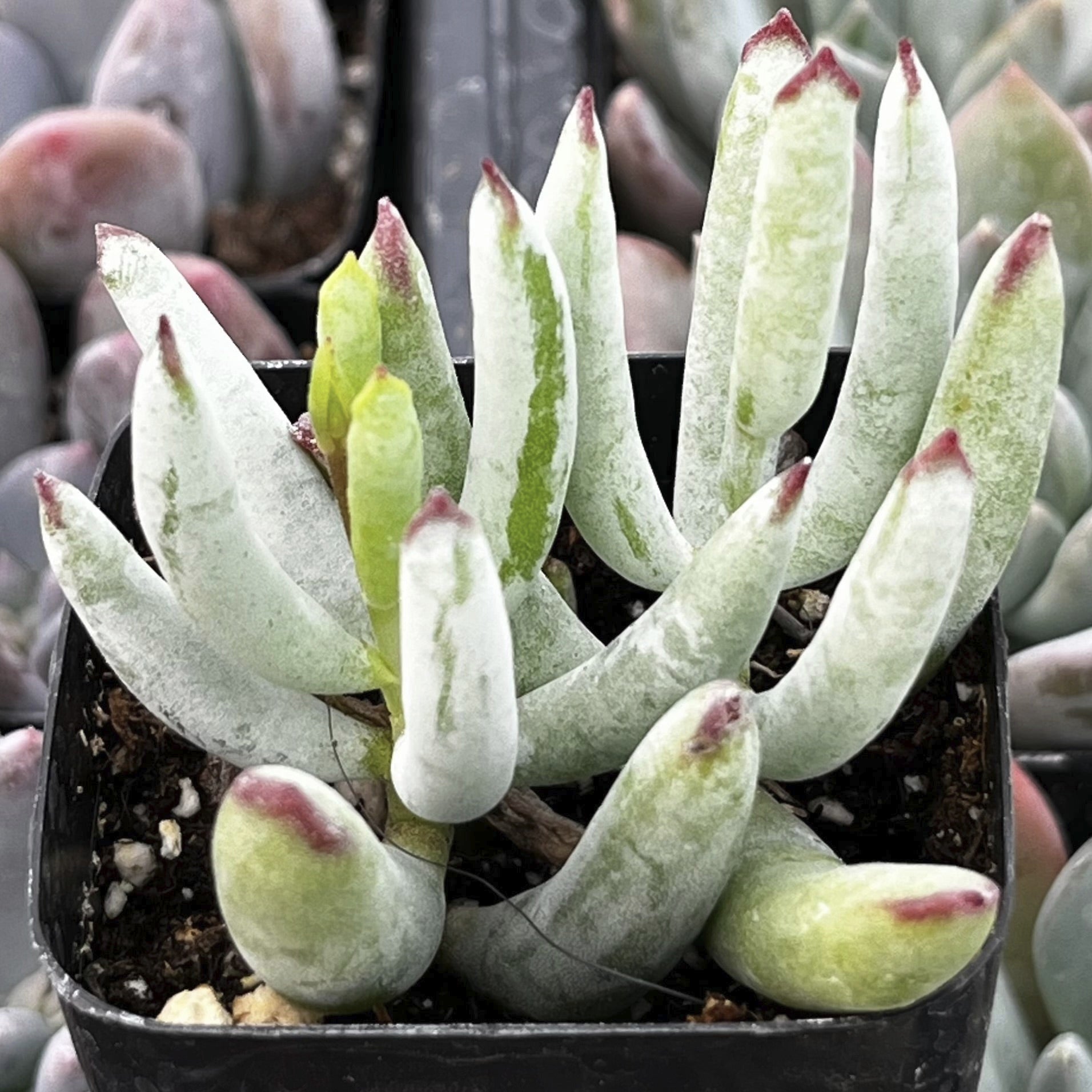 With its wintery glow and refined form, Cotyledon ‘White Sprite’ brings a clean, elegant touch to succulent displays, containers, and minimalist arrangements.