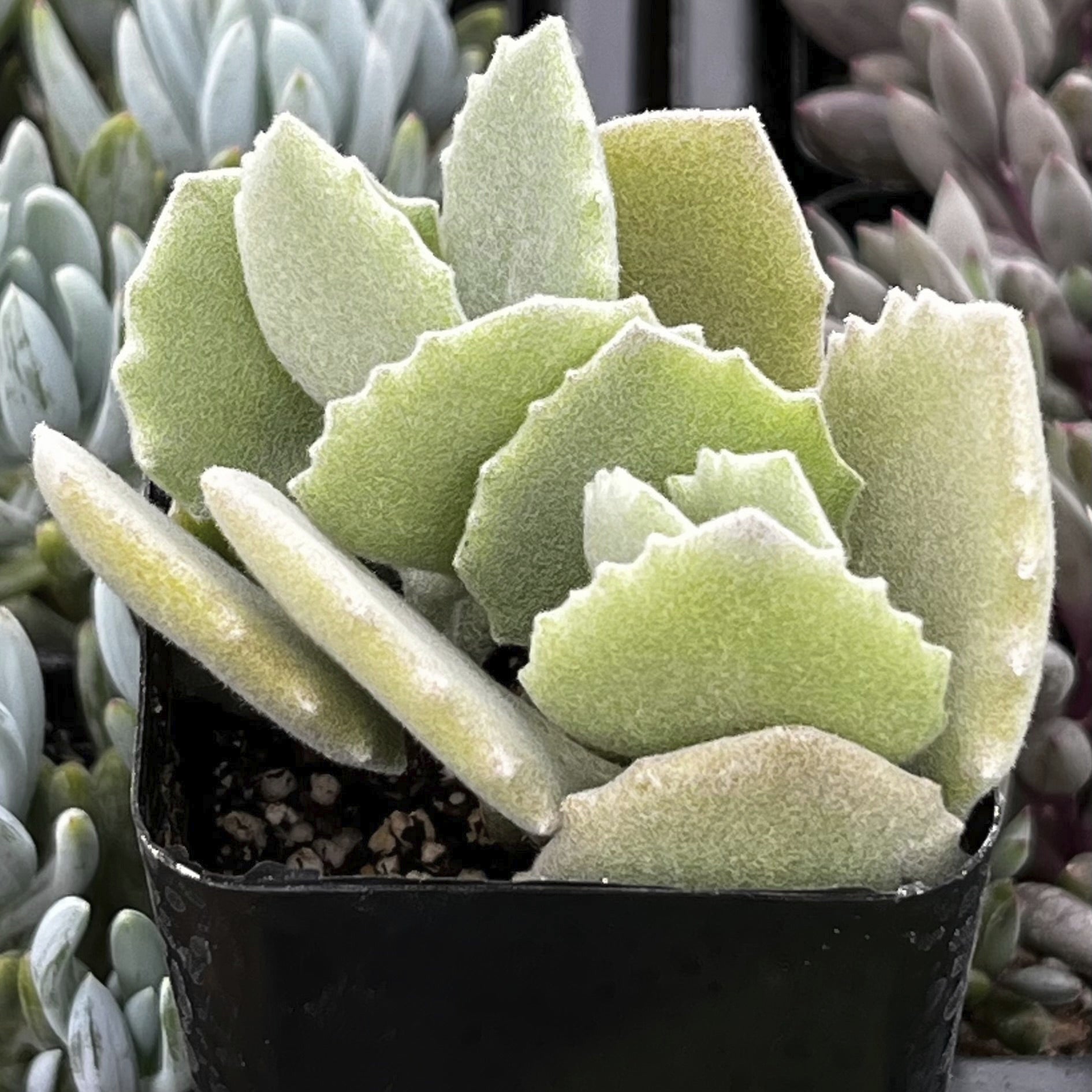 The Kalanchoe Millotii is a charming, soft-leaved succulent known for its velvety, scalloped foliage. Its small, oval-shaped leaves are covered in fine silvery-green hairs, giving them a plush texture and a muted, pastel appearance. This compact-growing plant is perfect for small pots, succulent arrangements, or as a unique accent in any collection.