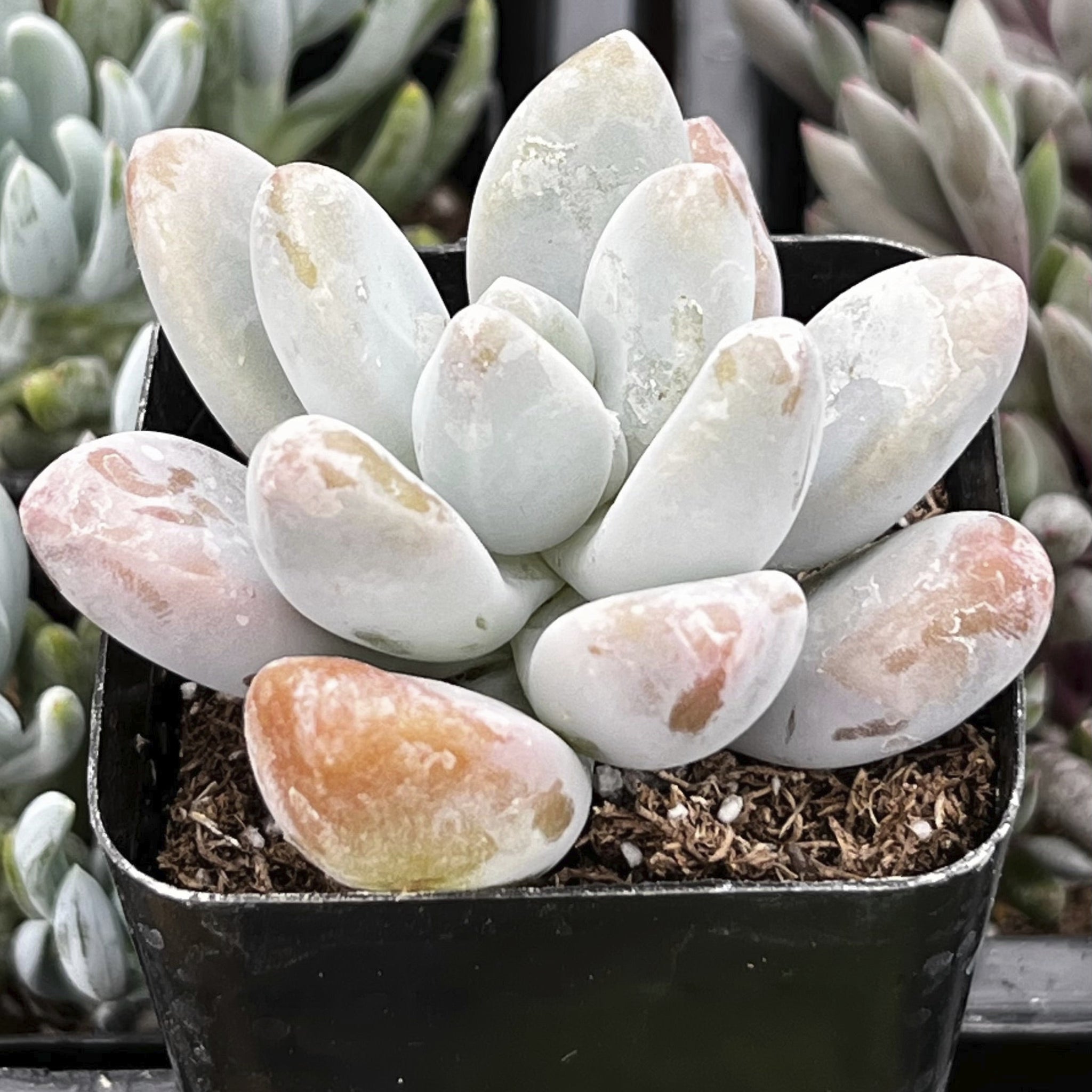 The Pachyphytum 'Blue Haze' is a mesmerizing succulent with plump, oval-shaped leaves coated in a thick layer of silvery-blue farina. This powdery coating gives the plant a soft, dreamy appearance, with subtle hints of lavender or pink emerging in cooler temperatures or bright sunlight. Its compact, trailing growth makes it a perfect choice for container gardens, succulent arrangements, or hanging planters.