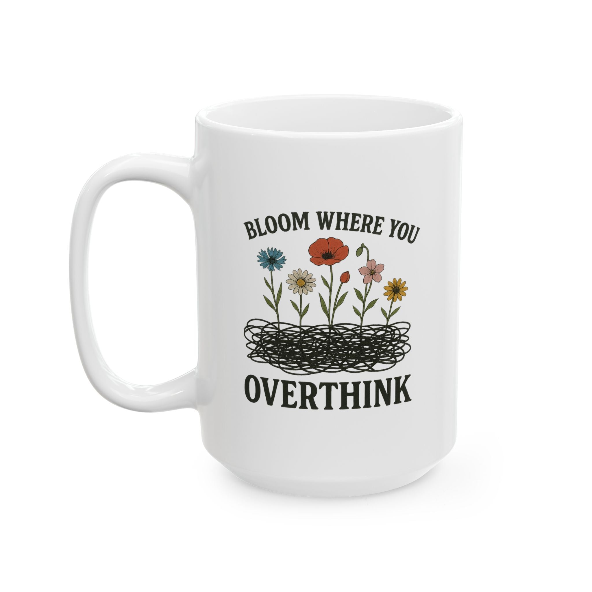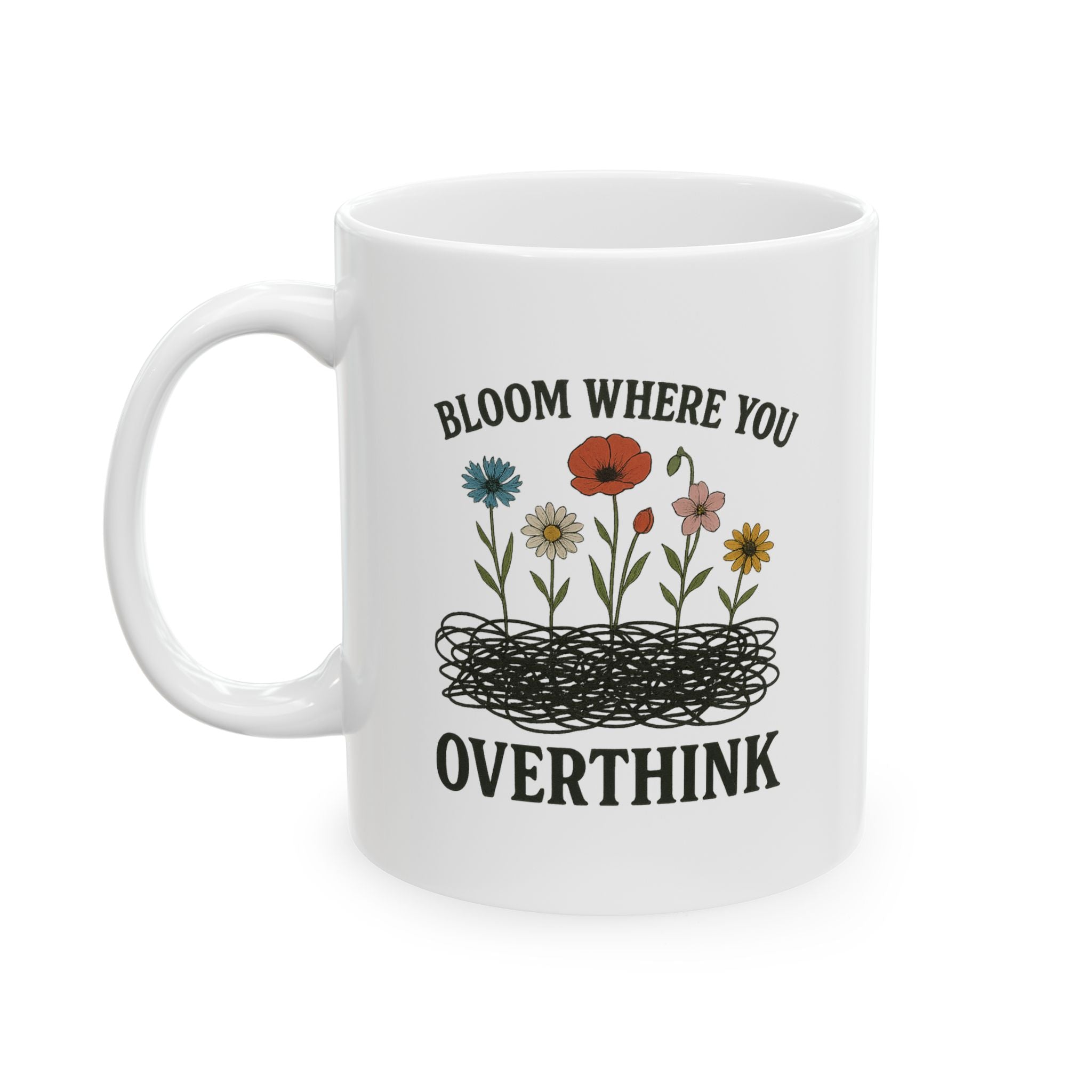 Let your tangled thoughts blossom into beauty with our "Bloom Where You Overthink" mug. This eye-catching design features chaotic scribbles sprouting with vivid wildflowers—poppy, daisy, cornflower, and more—reminding us that growth can come from even the messiest places. The bold vintage lettering and hand-drawn art create a perfect mix of whimsy and raw honesty.