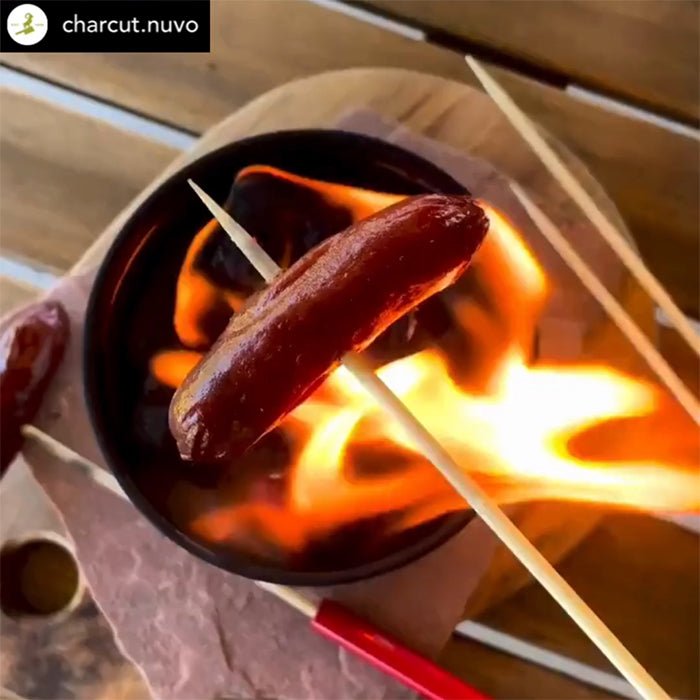 It comes in a small tin that is filled with wax that you just need to start with a torch lighter, and it will build all on its own into a large bonfire that you can sit around wherever you are!
