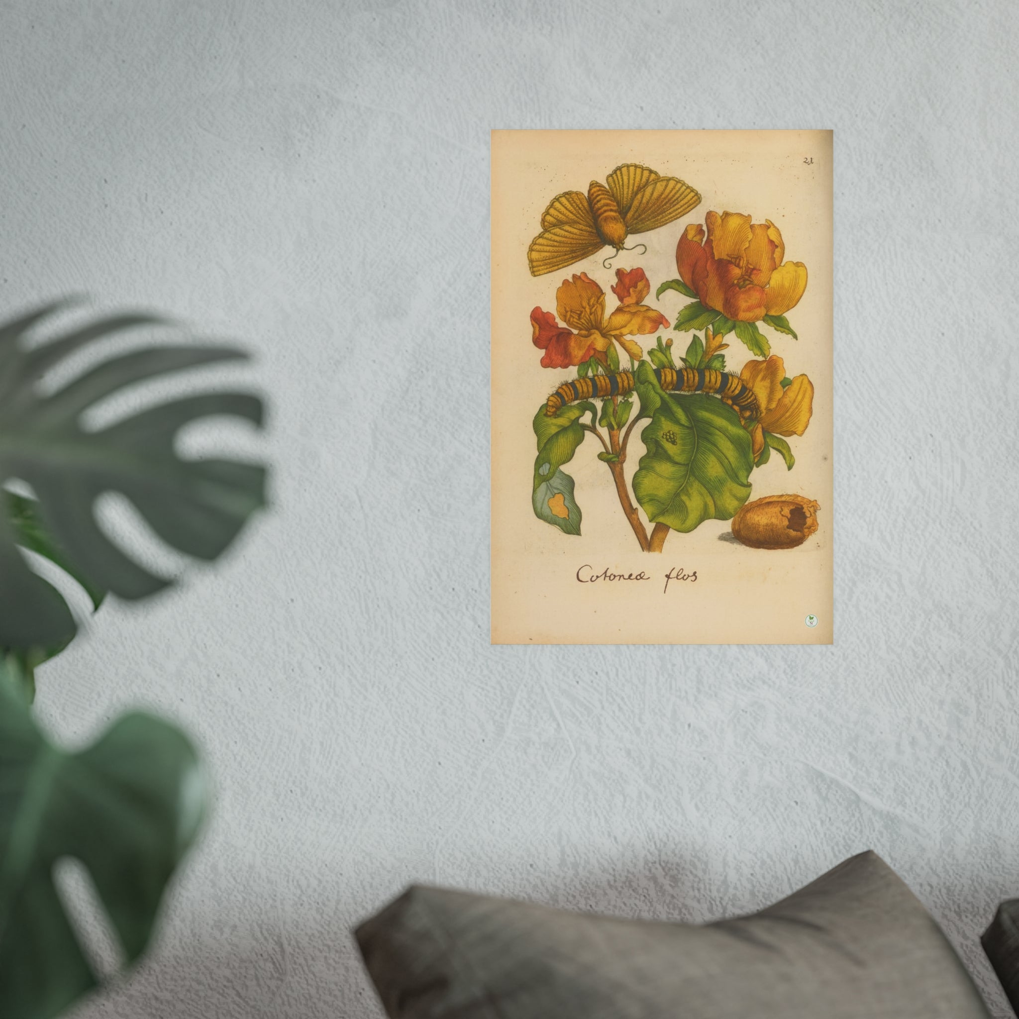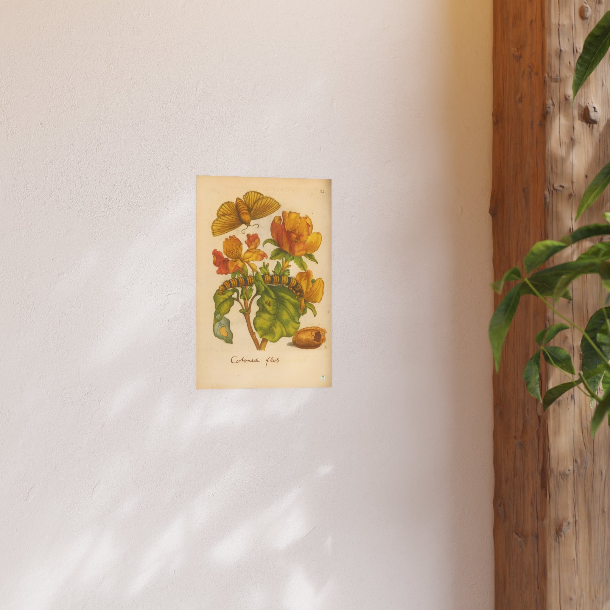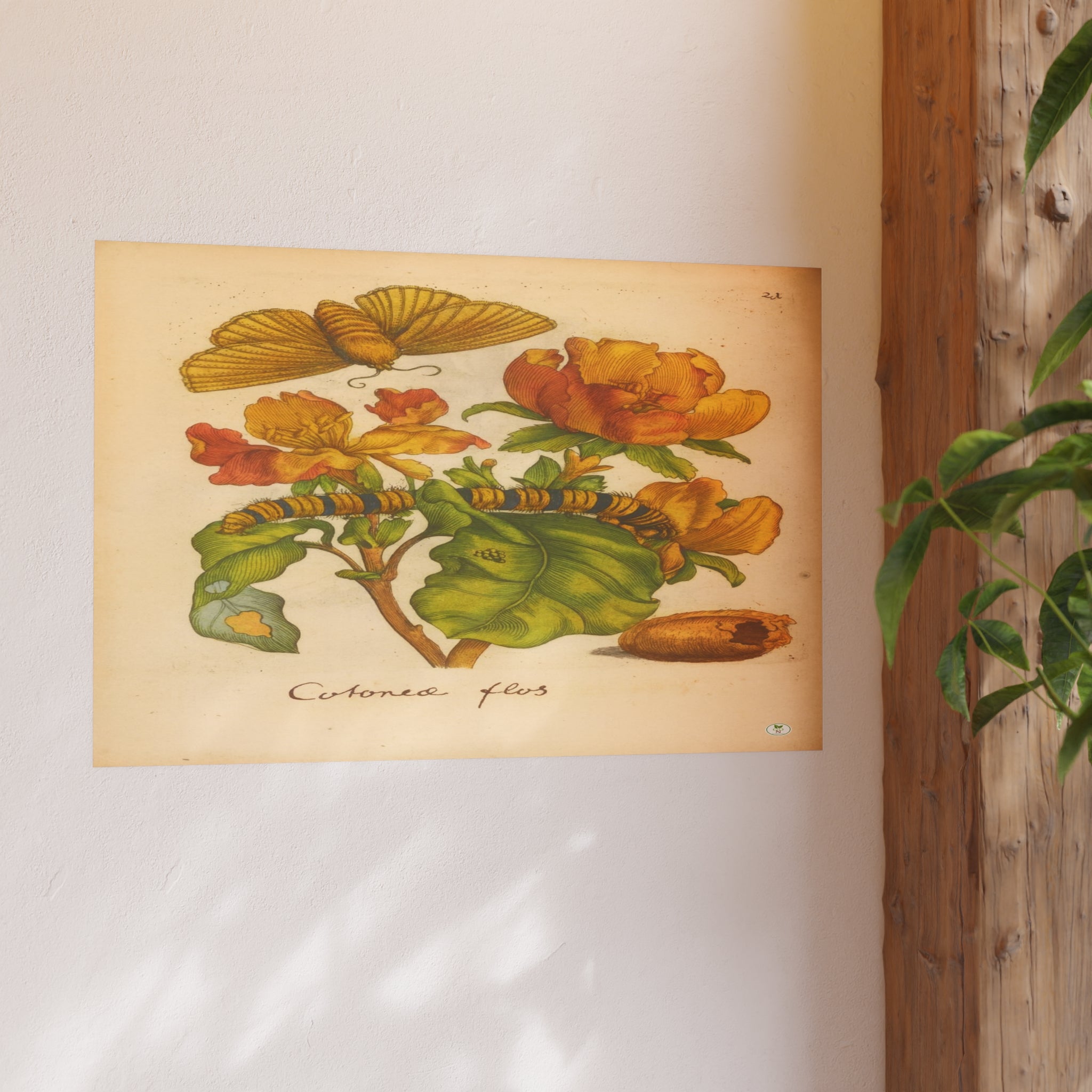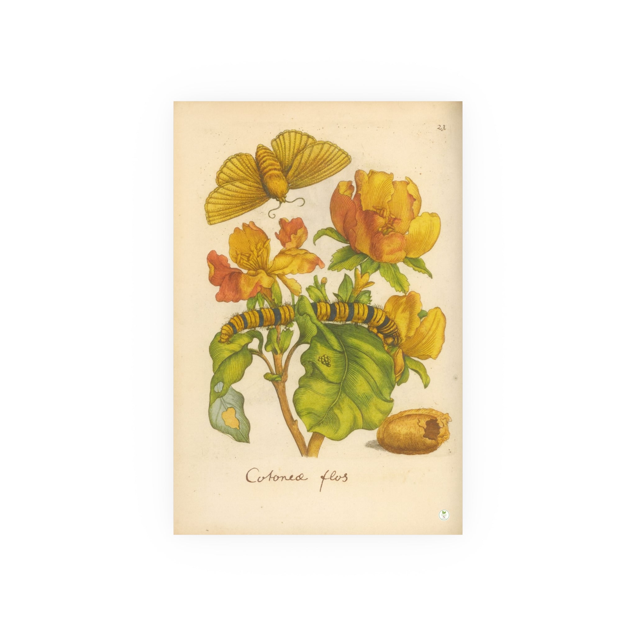 This masterfully colorized reproduction brings to life Cotonea flos (Cotton) depicted in full bloom alongside the mysteries of insect transformation. First engraved in the 17th century for Johannes Goedaert’s Erucarum ortus, alimentum et paradoxa metamorphosis, the plate captures not only the flower’s vivid blossoms and lush foliage but also the metamorphic cycle: eggs upon a leaf, the striped caterpillar feeding, the silken cocoon, and the emerging butterfly poised in flight. Each detail reflects Goedaert’s devotion to observing creation with accuracy and reverence. Restored with authentic tones, this exclusive GoGardenNow.com edition unites botanical art and natural history, making it an essential addition for collectors of historic prints and lovers of the garden’s enduring beauty.