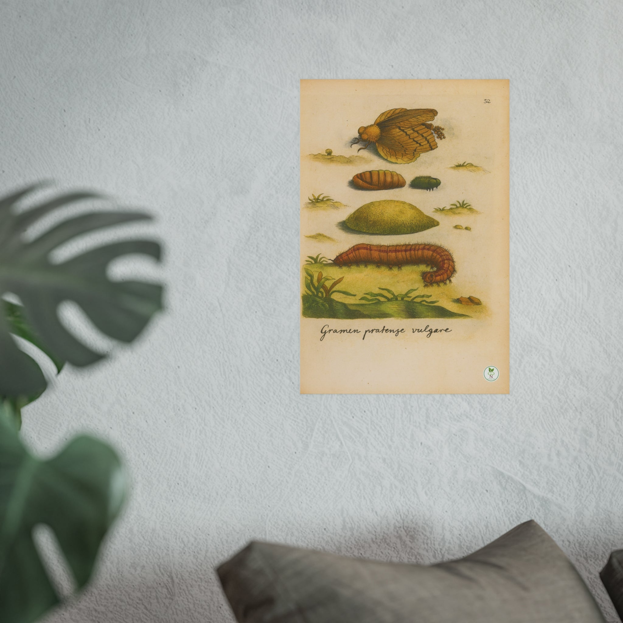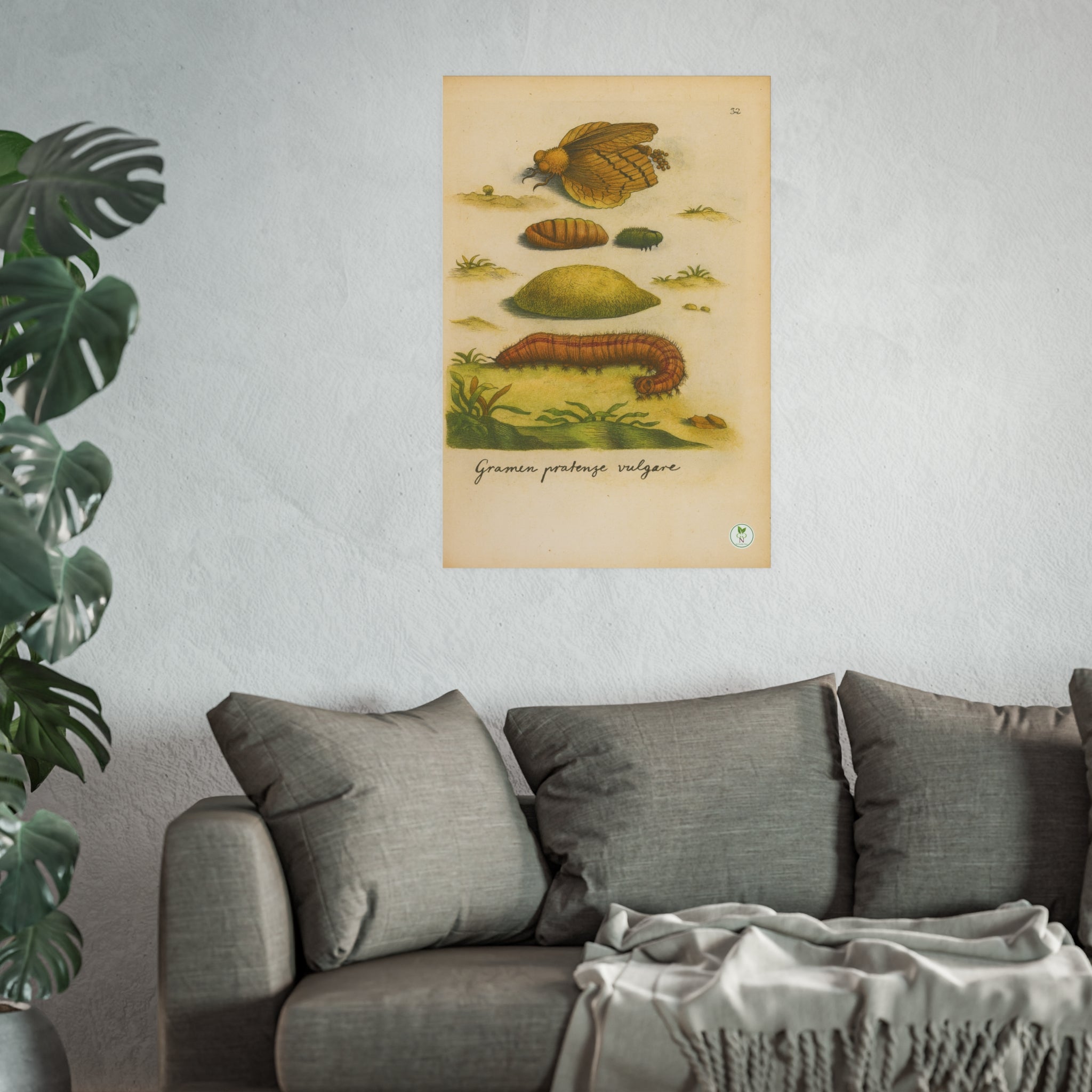 This reproduction of Gramen pratense vulgare (common meadow grass) depicts not only the plant itself but also the remarkable transformation of a moth across its life stages. From egg to caterpillar, cocoon, pupa, and winged adult, each form is arranged around the delicate blades of grass. The moth, shown in warm earthy tones, contrasts with the vivid green of the meadow grass, while the caterpillar and chrysalis appear in natural hues. The illustration reveals both the quiet beauty of the plant and its essential role in sustaining insect life.