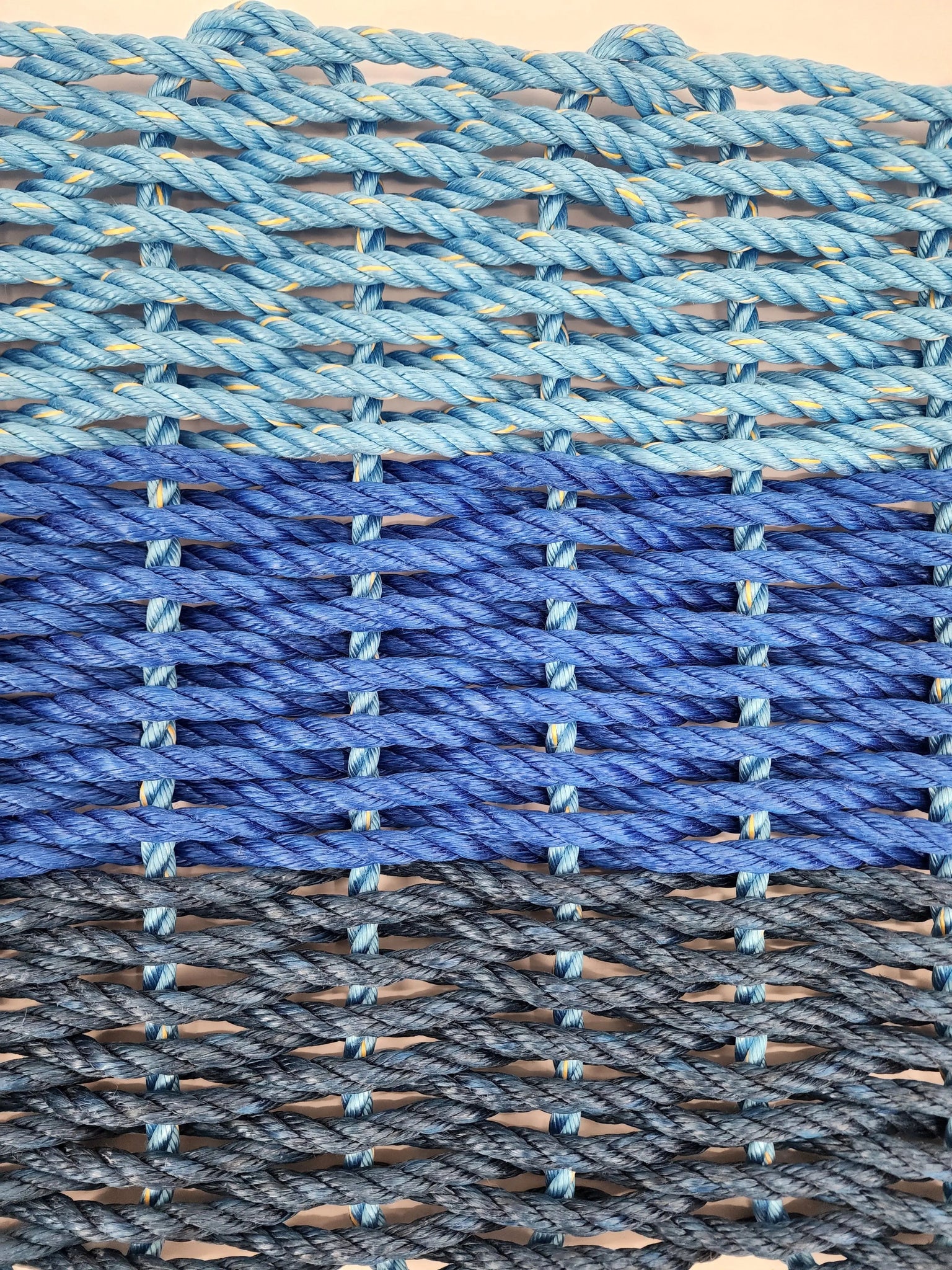 A beautiful Navy Blue, Royal Blue, Light Blue Ombre, hand made rope mat made on the coast of Maine using the very same rope that lobstermen use to tend their traps.