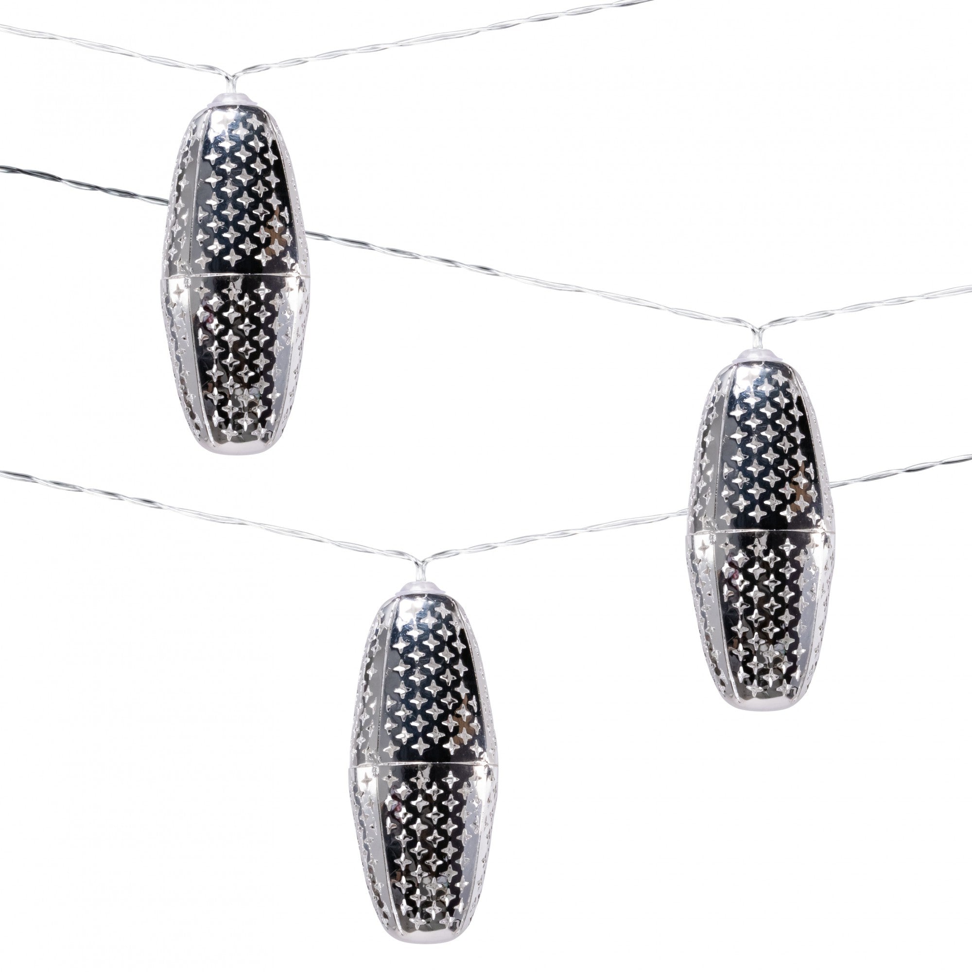 Add exotic elegance, warmth and charm to your outdoor space with the Marrakesh Metallic Solar String Lights. Inspired by the intricate lanterns found in the bustling bazaars of Morocco, each strand features 10 hand-crafted metal lanterns with detailed punched patterns that cast glimmering light when the sun goes down . By day, the metallic finish catches the sun; by night, the solar-powered LEDs cast shimmering patterns for an atmosphere that feels both sophisticated and magical.
