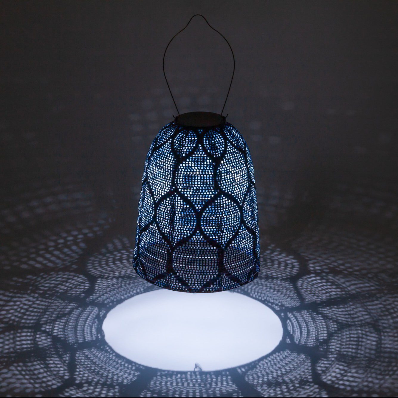 Inspired by lanterns found in the bazaars of Morocco, the Soji Stella Bell Lantern is ornately punched and brightly colored in ultramarine tones. As the sun goes down, intricate patterns of light emit from the lantern.