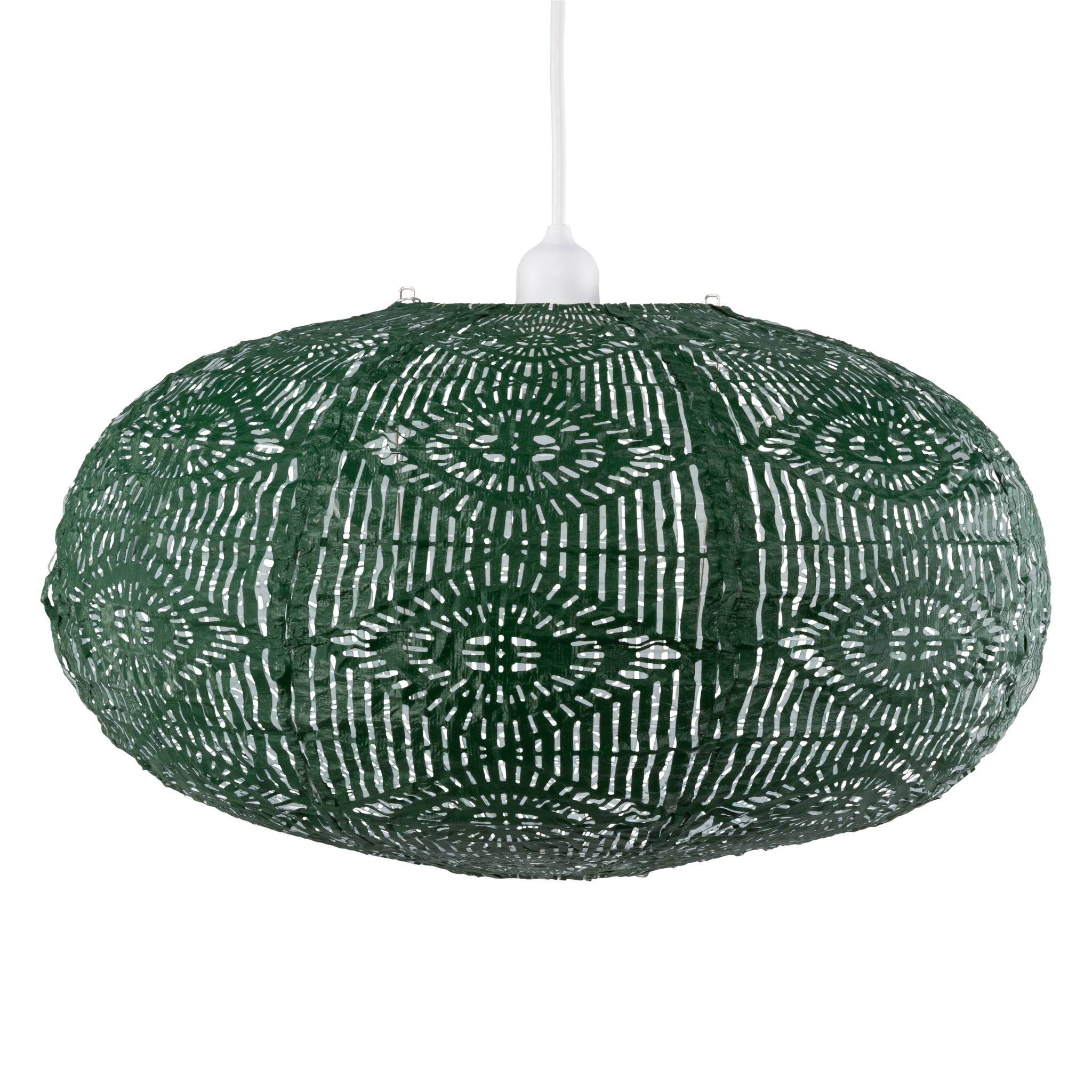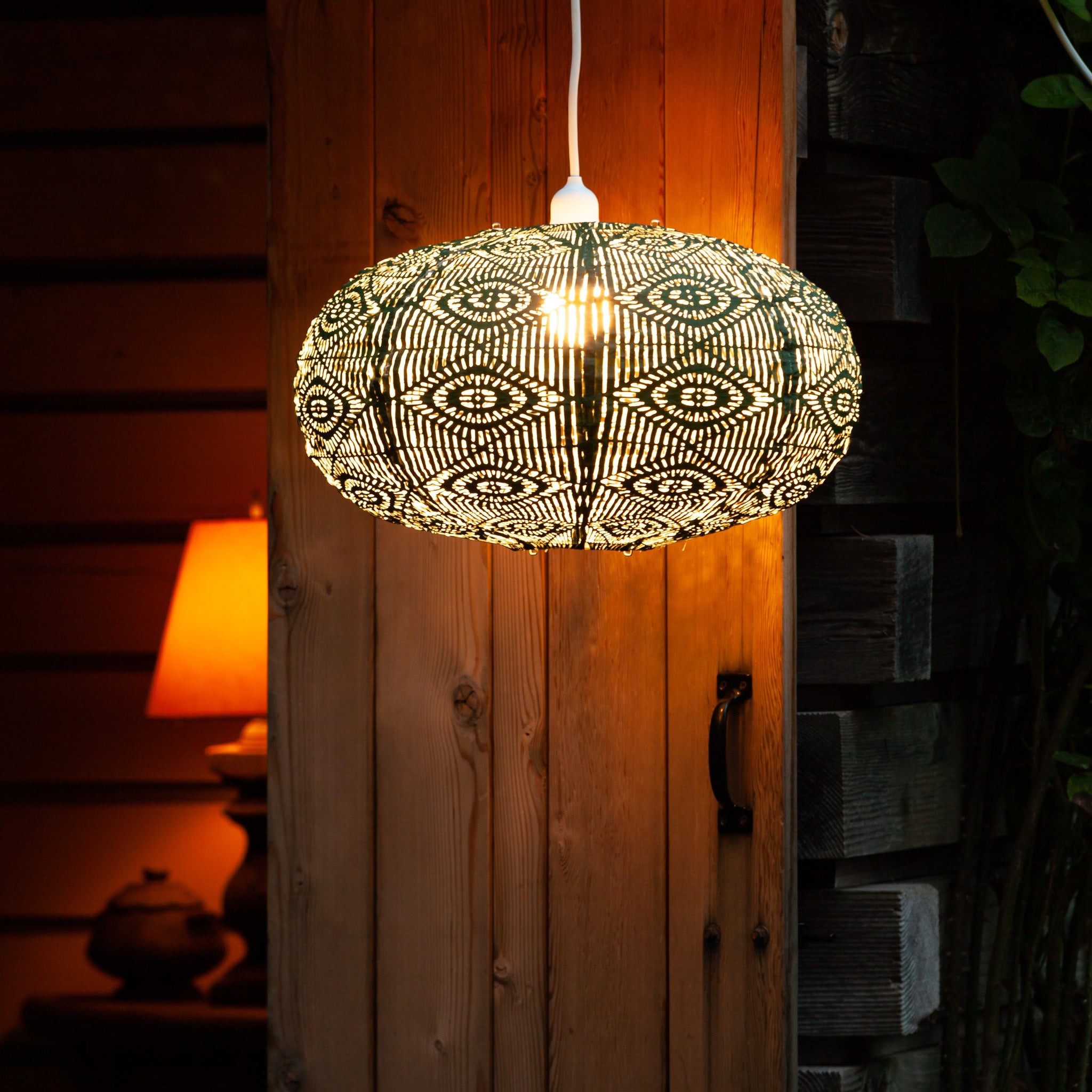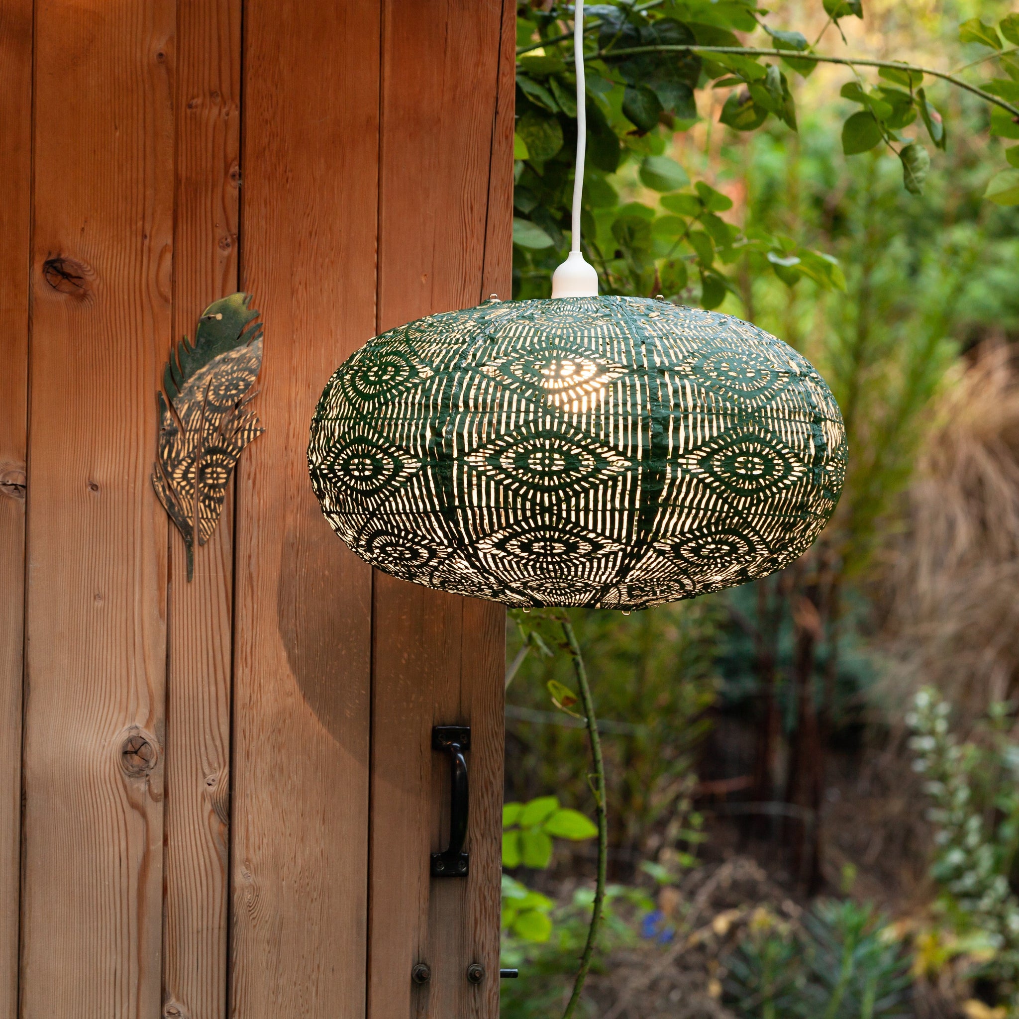 Make a bold statement with the Stella Nova Starbeam Pendant Lamp. Its large oval silhouette, rich evergreen color, and intricate laser-cut diamond patterns create a striking focal point in any space—indoors or out.