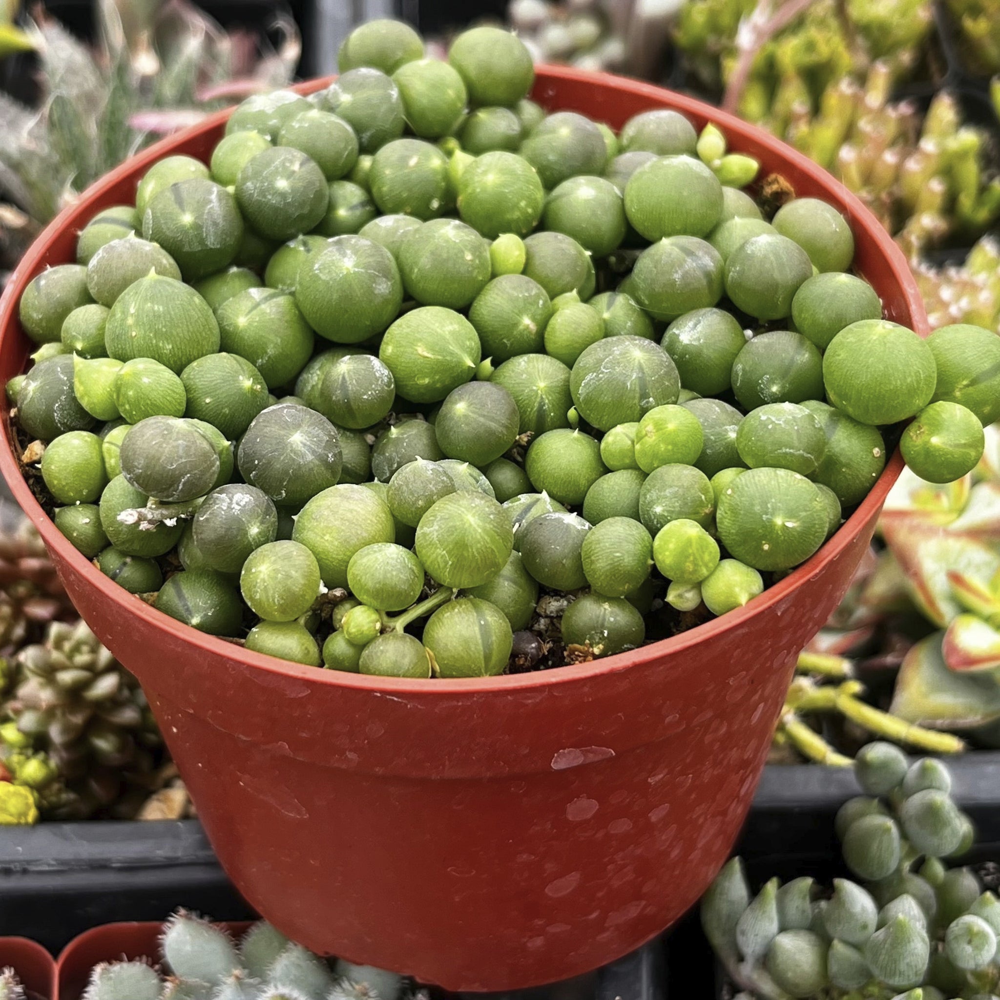 Meet the String of Pearls, a captivating trailing succulent that brings elegance to any setting! This plant features long, slender stems adorned with perfectly round, bead-like green leaves, resembling a cascade of pearls. Ideal for hanging baskets or shelf displays, the String of Pearls creates a stunning, whimsical effect as it drapes beautifully.