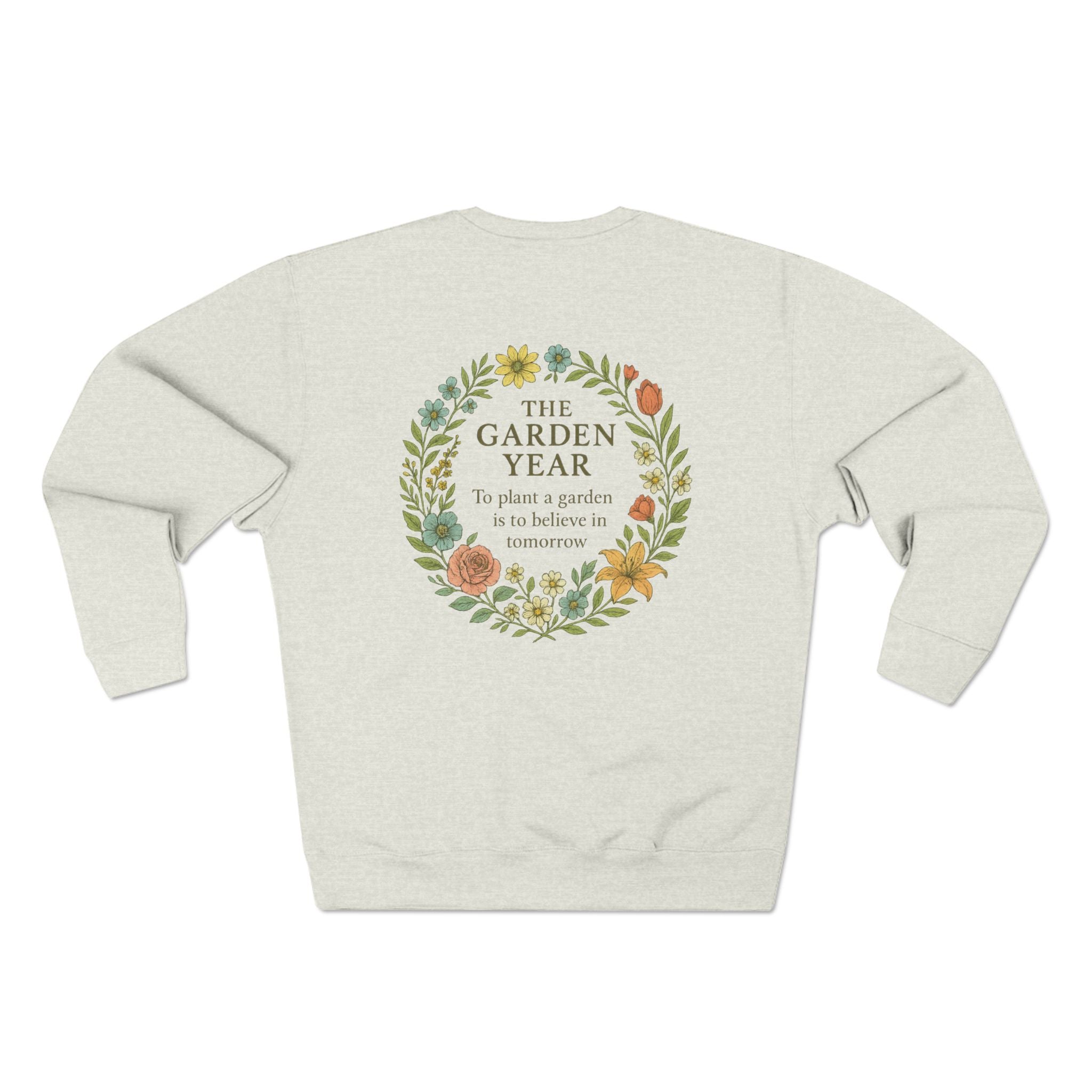 Celebrate the beauty of every season with the “The Garden Year” floral wreath sweatshirt. Featuring a vintage-inspired ring of flowers encircling the hopeful words, “To plant a garden is to believe in tomorrow”, this design brings poetry and color to your cool-weather wardrobe. The GoGardenNow logo is proudly displayed on the front, while the inspiring graphic adorns the back, making it a perfect blend of comfort, charm, and meaning. Wrap yourself in warmth and let your sweatshirt speak the gardener’s creed—order yours today.
